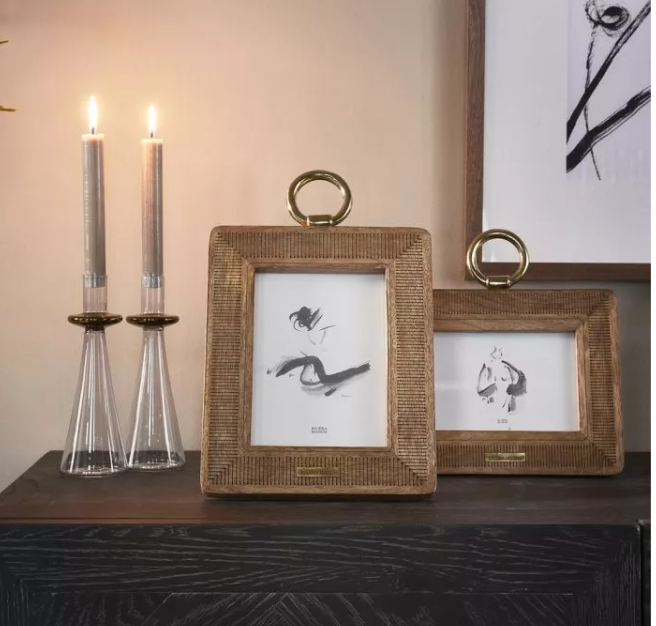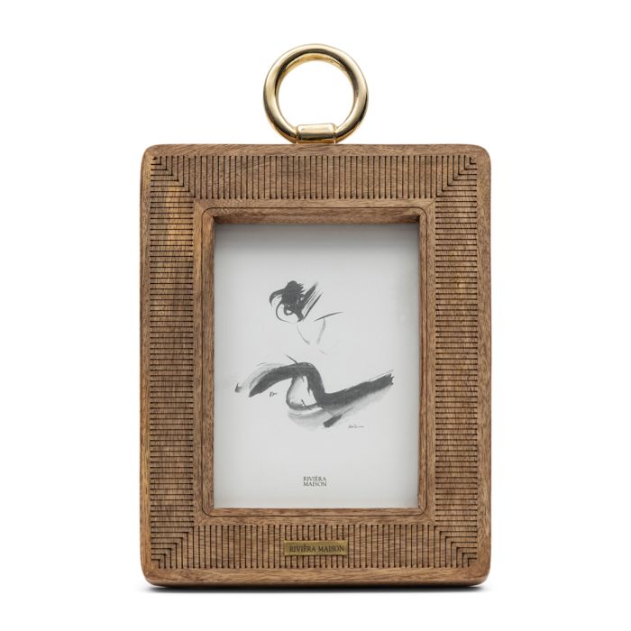 Der RM Makena Fotorahmen ist ein etwas größerer Fotorahmen aus Mangoholz. In das Holz ist ein sehr feines Streifenmuster eingebrannt. Zusammen mit den abgerundeten Ecken entsteht so ein spielerisches Ganzes. Der Rahmen kann an dem goldenen Ring an der Oberseite aufgehängt werden, Sie können ihn aber auch aufrecht stellen. Der Rahmen ist für ein 13x18cm großes Foto im Hochformat geeignet.